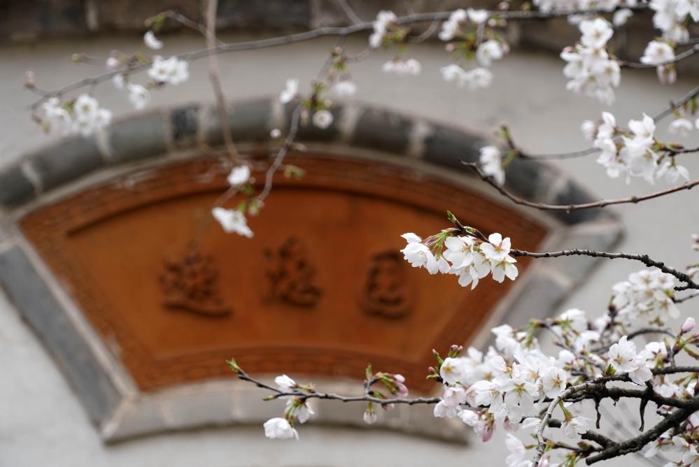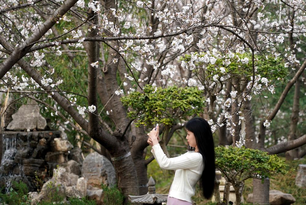 游客在位于河南省鄢陵县的一处园林内赏景拍照(3月26日摄)。