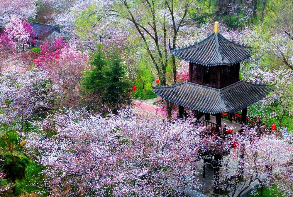 这是3月28日拍摄的位于河南省鄢陵县的一处园林(无人机照片)。