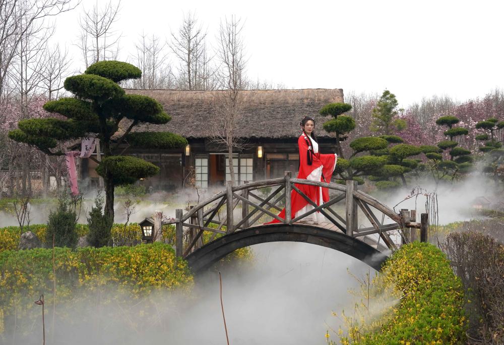 身着传统服饰的游客在位于河南省鄢陵县的一处园林内拍照(3月26日摄)。