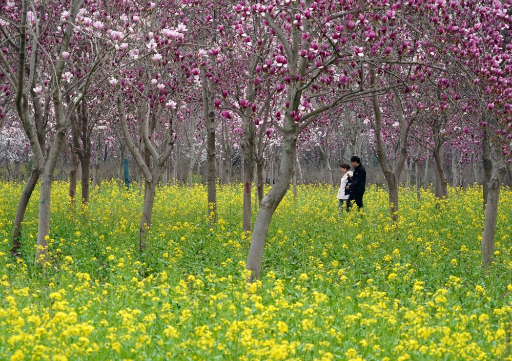 游客在位于河南省鄢陵县的一处园林内赏花游玩(3月26日摄)。