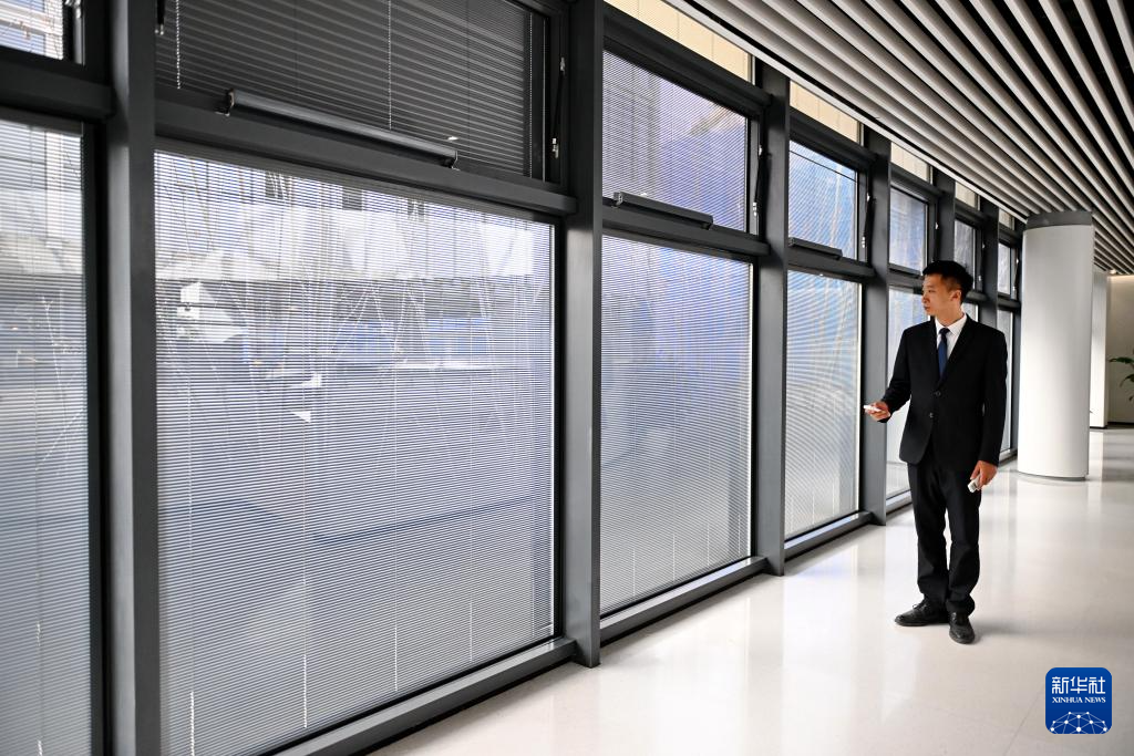 3月28日,雄安自贸试验区交流展示中心的工作人员在展示兼具保温与遮阳效果的镀膜玻璃,该中心是首批通过新区专家评审的零碳示范建筑。