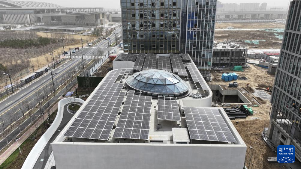 雄安自贸试验区交流展示中心是首批通过新区专家评审的零碳示范建筑,这是该中心屋顶的光伏发电设施(3月28日摄,无人机照片)。