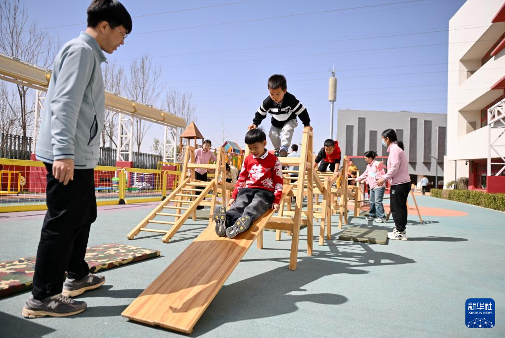 3月29日,雄安北海幼儿园的孩子们在室外做游戏。