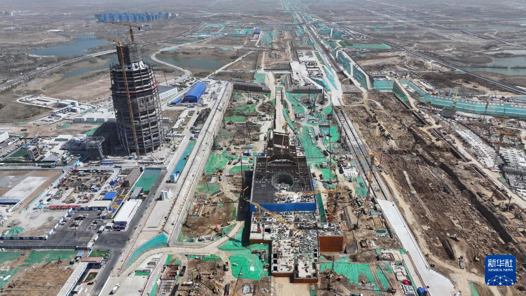 这是位于雄安新区启动区内雄安城际站及国贸中心片区建设现场(3月29日摄,无人机照片)。
