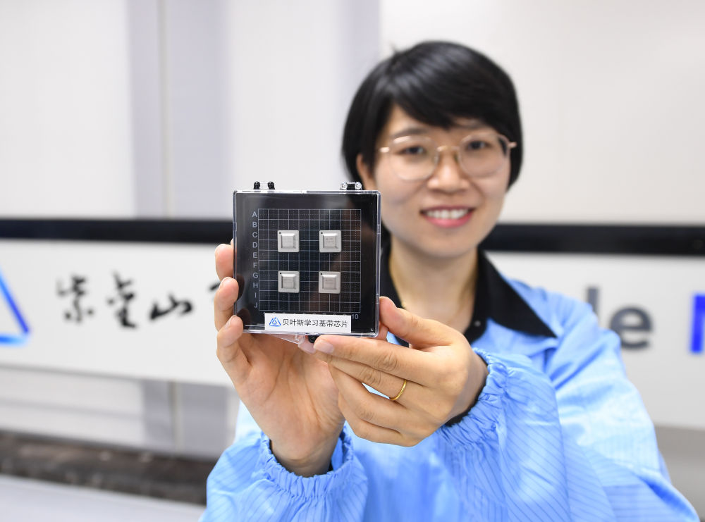 在南京紫金山实验室6G综合实验室,科研人员展示自主研发的贝叶斯学习基带芯片(2023年7月6日摄)。新华社记者 季春鹏 摄