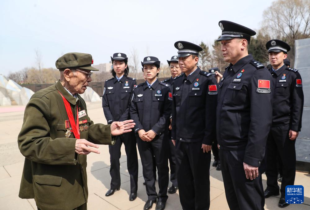 4月2日,在沈阳抗美援朝烈士陵园,志愿军老战士金东辉(左一)为沈阳出入境边防检查站民警讲述战斗故事。