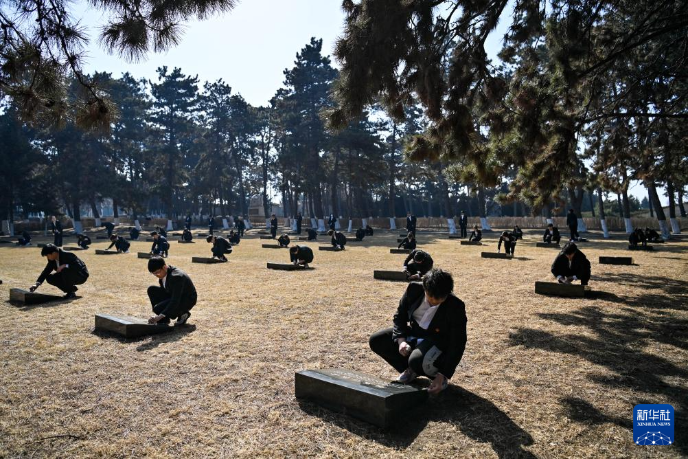 4月2日,在沈阳抗美援朝烈士陵园,沈阳出入境边防检查站民警擦拭烈士墓碑。