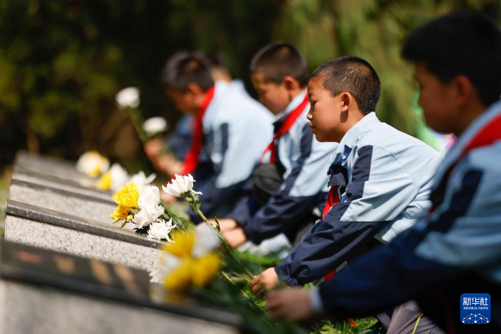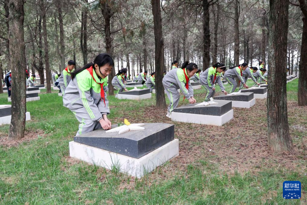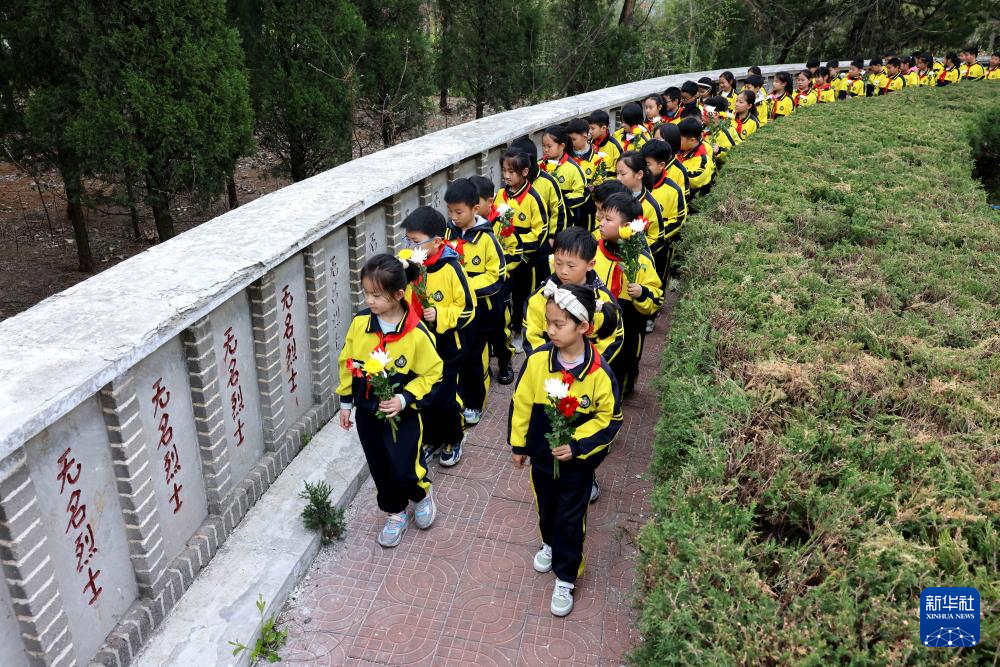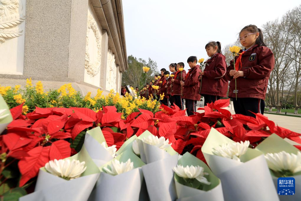 4月2日,在位于河北省石家庄市的华北军区烈士陵园,学生们为革命英烈献花。