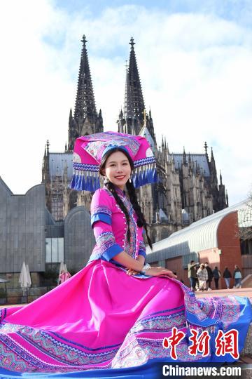 当地时间2月23日,杨月穿着壮族服饰亮相德国科隆。(受访者供图)