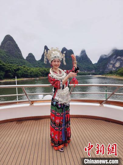 2023年10月,泰国女孩马惠桢穿着苗族服饰乘游船游览漓江。(受访者供图)