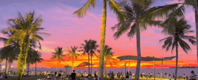 天刚黑,海口人最爱和家人朋友散步在海边,或在沙滩玩沙,或享受海风吹拂,一起度过静谧时光。