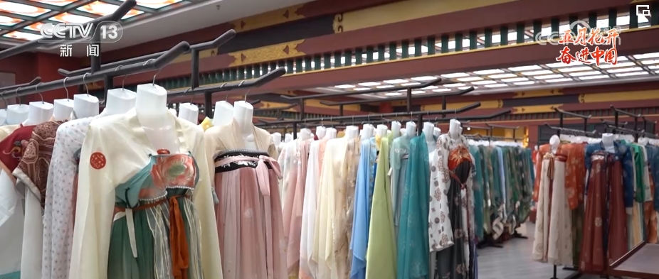 看起来对汉服造型颇有研究的胡芯银今年只有24岁。胡芯银介绍,也就是在这几年,随着大家对传统文化的喜爱,西安的汉服馆如雨后春笋般涌现。感受到“汉服热”的胡芯银在2022年初,辞去了原先婚礼跟妆的工作,应聘到了这家位于长安十二时辰主题街区附近的汉服馆,担任汉服造型师。