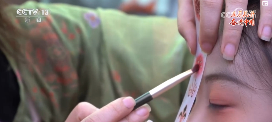 花钿是古代女性在额头部位点缀的一种花饰。现在的胡芯银,不仅会根据顾客的年龄、脸型和服装的样式来搭配不同风格的花钿,还会给小姐姐们做一些传统文化的讲解。胡芯银说,要想做得更好,就要多看多学。