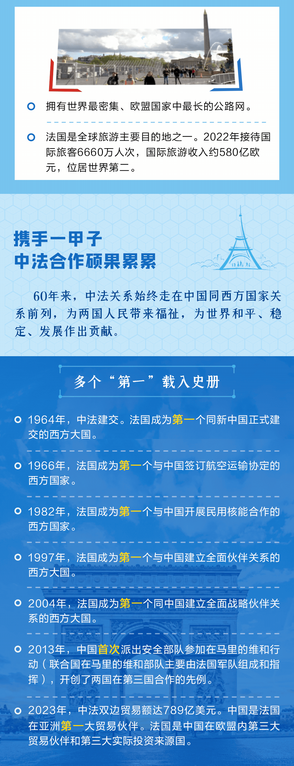 今年是中法建交60周年。60年来,秉承独立自主、相互理解、高瞻远瞩、互利共赢的“中法精神”,两国关系走过了一段极不寻常的历程。央视网《联播+》特推出长图,与您一同了解。