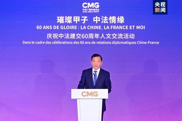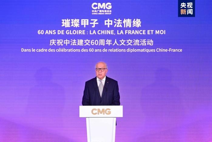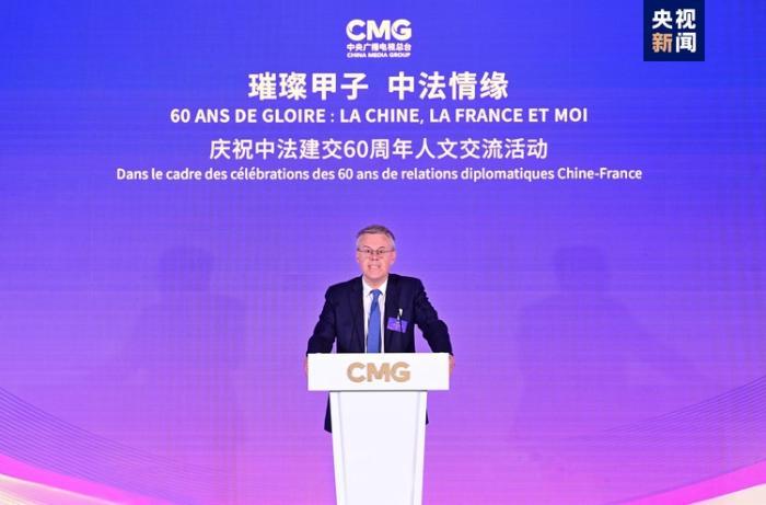慎海雄说,中法建交60年来,两国塑造了独立自主、相互理解、高瞻远瞩、互利共赢的“中法精神”,已成为不同历史背景、文化传统和发展水平的国家之间友好合作的典范。在中法双边关系不断发展的进程中,媒体作为人文交流的桥梁纽带,发挥着促进民心相通、增进友好互信的作用。今年以来,中央广播电视总台相继推出《璀璨甲子 中法建交60周年高端对话》《超越时代的大智慧、大勇气——走近戴高乐》等一系列中法合拍精品节目,发布“中国艺术推广计划”数字特展等融媒体产品,为两国交流互鉴画上浓墨重彩的一笔。总台还将派出超2000人的团队转播报道巴黎奥运会,借奥林匹克协同之力搭建起更加坚实的相知相识之桥。站在中法建交60周年的历史节点,总台将以“思想+艺术+技术”的融合传播,与法国朋友们再续中法携手同行一甲子的友谊情缘。