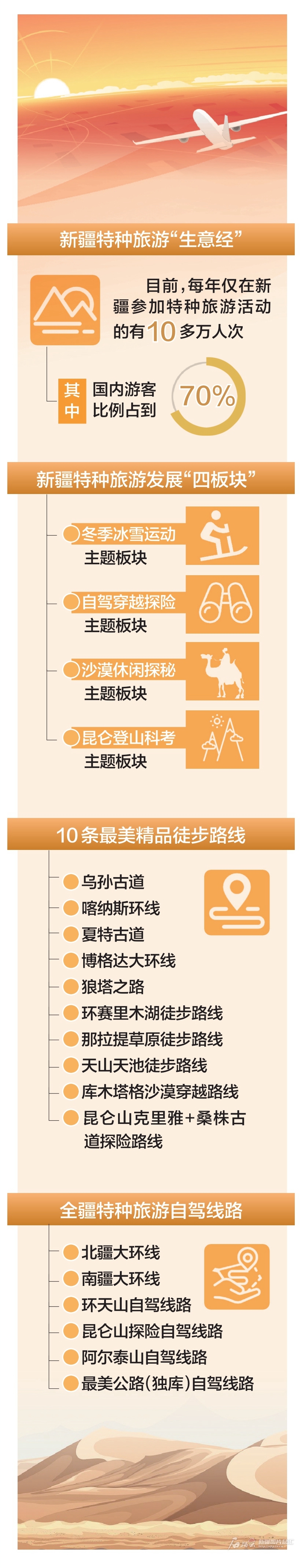 在前不久举行的“荒野之旅 探秘新疆”2024新疆特种旅游节上,新疆围绕特种旅游资源,发布了2024中国环塔国际拉力赛、中国新疆伊犁天马国际旅游节赛马比赛、新疆·吐鲁番第13届环艾丁湖摩托车拉力赛等十大精品赛事,打造“跟着赛事去旅游”品牌,进一步丰富了“新疆是个好地方”金字招牌。
