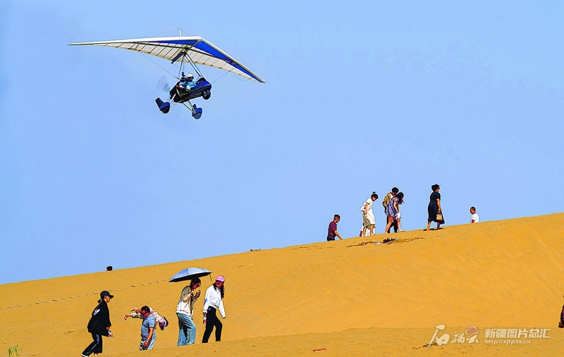 近日,在尉犁县罗布人村寨景区,一架滑翔机从沙山上空飞过。近年来,尉犁县以服务游客、方便游客、提升游客体验感为目标,增加露营地、水上汽艇、滑翔机体验等项目,以优质服务迎接八方游客。 □汪志鹏摄