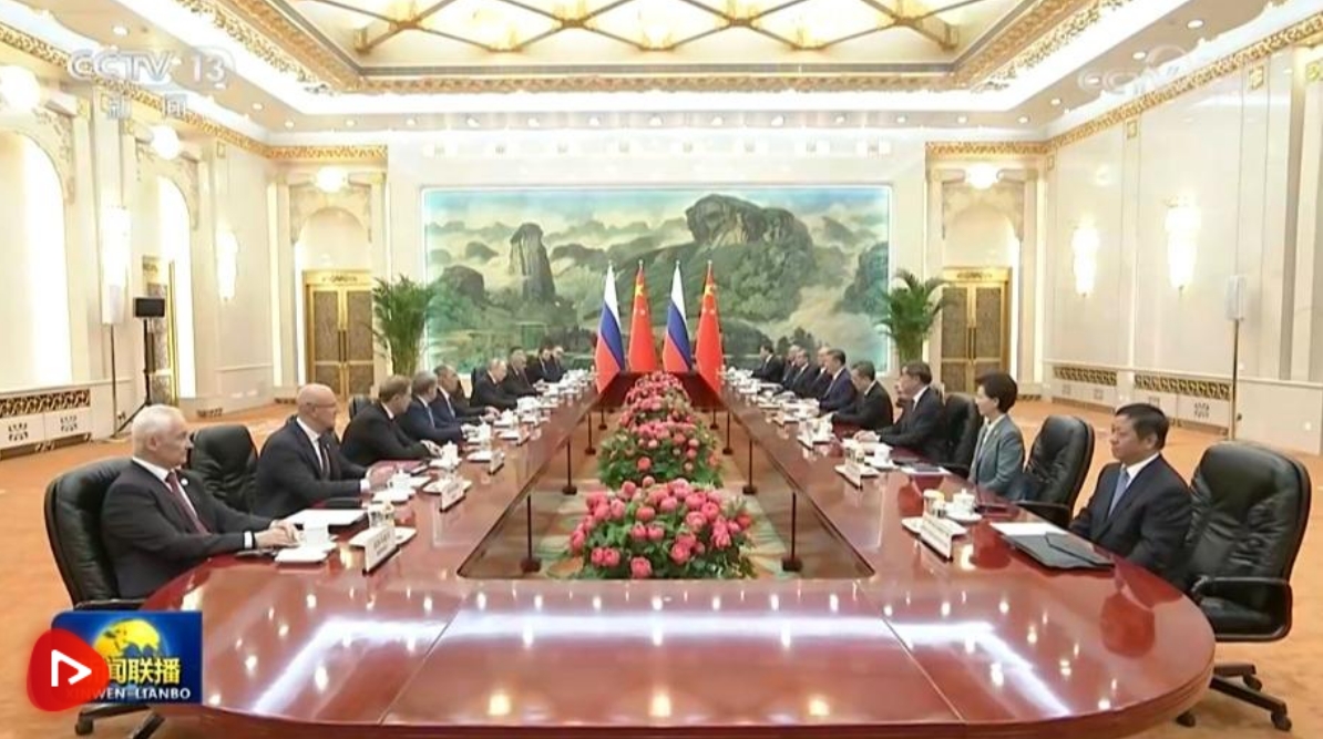 普京表示,我很高兴在就任新一届俄罗斯总统后再次访华。去年3月习近平主席也在连任后不久即对俄进行国事访问。这是我们两国的友好传统,表明双方对加强新时代俄中全面战略协作伙伴关系的高度重视。今年是中华人民共和国成立75周年,也是俄中建交75周年,值得我们共同庆祝。发展俄中关系不是权宜之计,不针对第三方,有利于国际战略稳定。俄方愿同中方持续扩大双边合作,密切在联合国、金砖国家、上海合作组织等框架内沟通协作,推动建立更加公正合理的国际秩序。