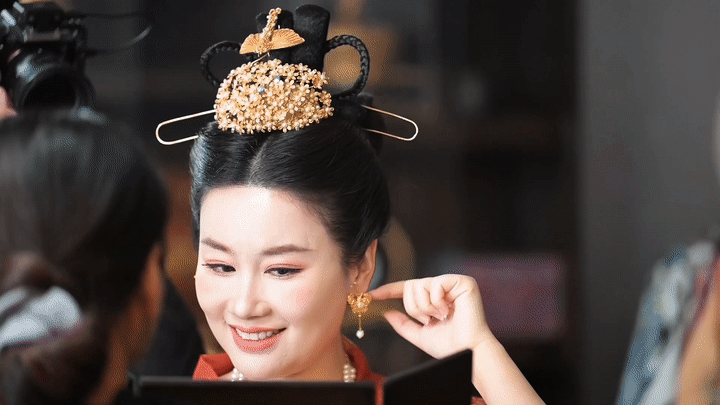 一名汉服爱好者在工作室内试戴花丝镶嵌技艺制作的头饰(3月7日摄)。新华社记者 孙凡越 摄