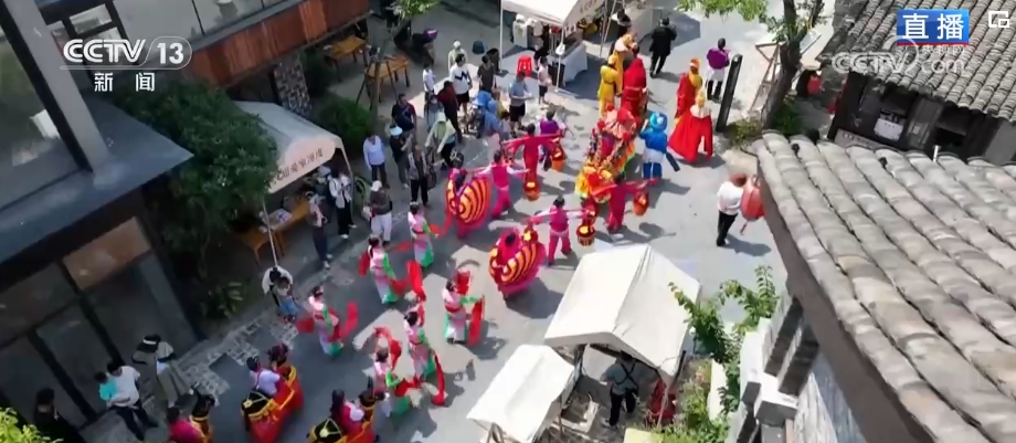除了逛吃逛吃,人们还可以在这里看到各种各样的民俗展演。在美食街前的空地上有打连厢、花船、撂地杂耍和徽剧等演出,还有传统非遗庐州绳艺。
