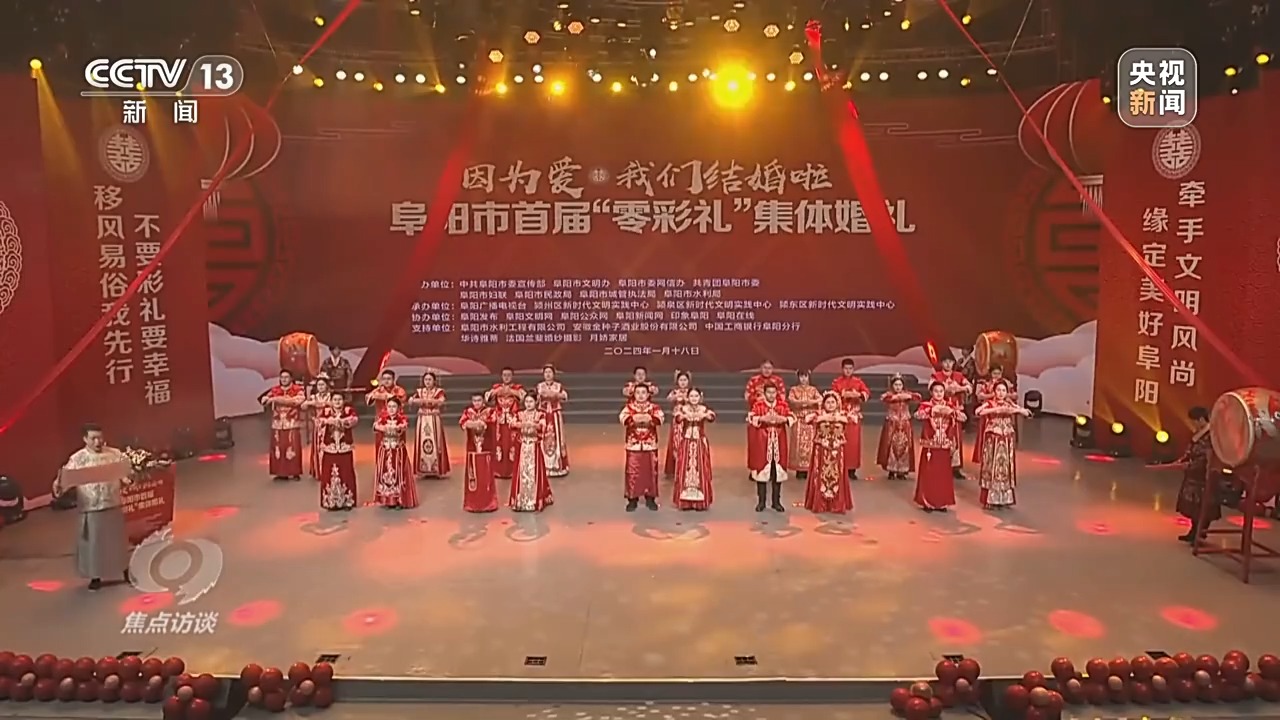 不久前,安徽阜阳当地40余家媒体共同直播了一场“零彩礼”集体婚礼,58对新人在亲人、观礼嘉宾及广大网友祝福声中,郑重许下相守一生的承诺。