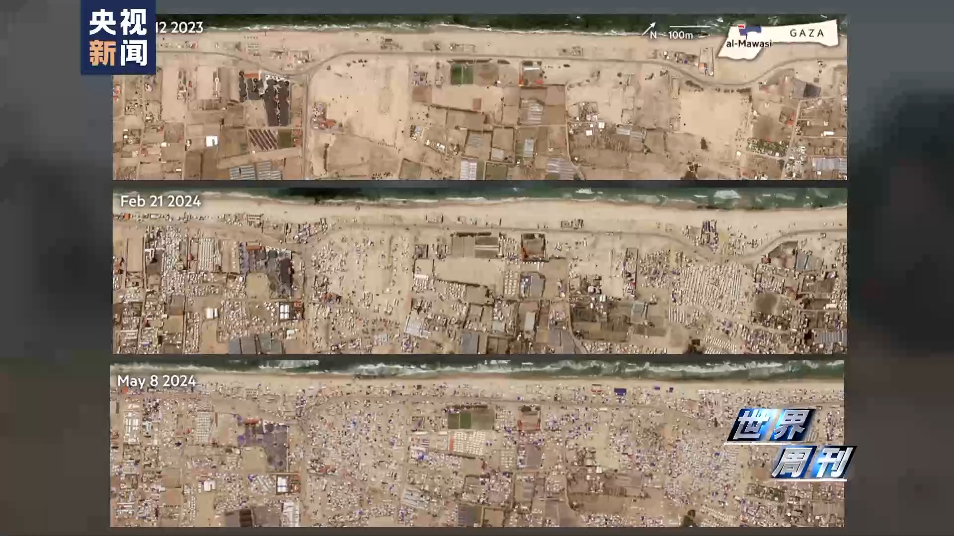 最新的卫星图像显示,这些人道主义区域布满了帐篷和塑料布搭建的临时建筑,甚至一路延伸到沙滩上,最近的一排距离大海只有几步之遥。