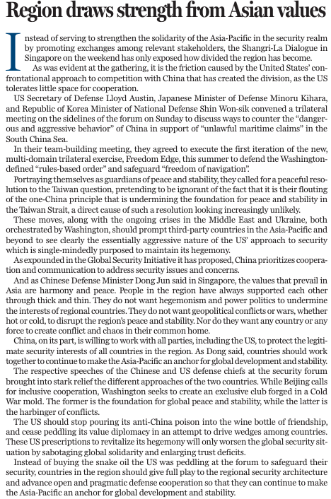 中国一向以和为贵,主张通过合作与交流来解决安全问题和关切,愿与各方一道,共同维护地区各国的正当安全利益。 地区国家与其吞下美国兜售的阵营对抗毒药,不如充分发挥地区安全架构的作用,推进开放务实的防务合作,使亚太继续成为全球发展与稳定之锚,造福各国人民。
