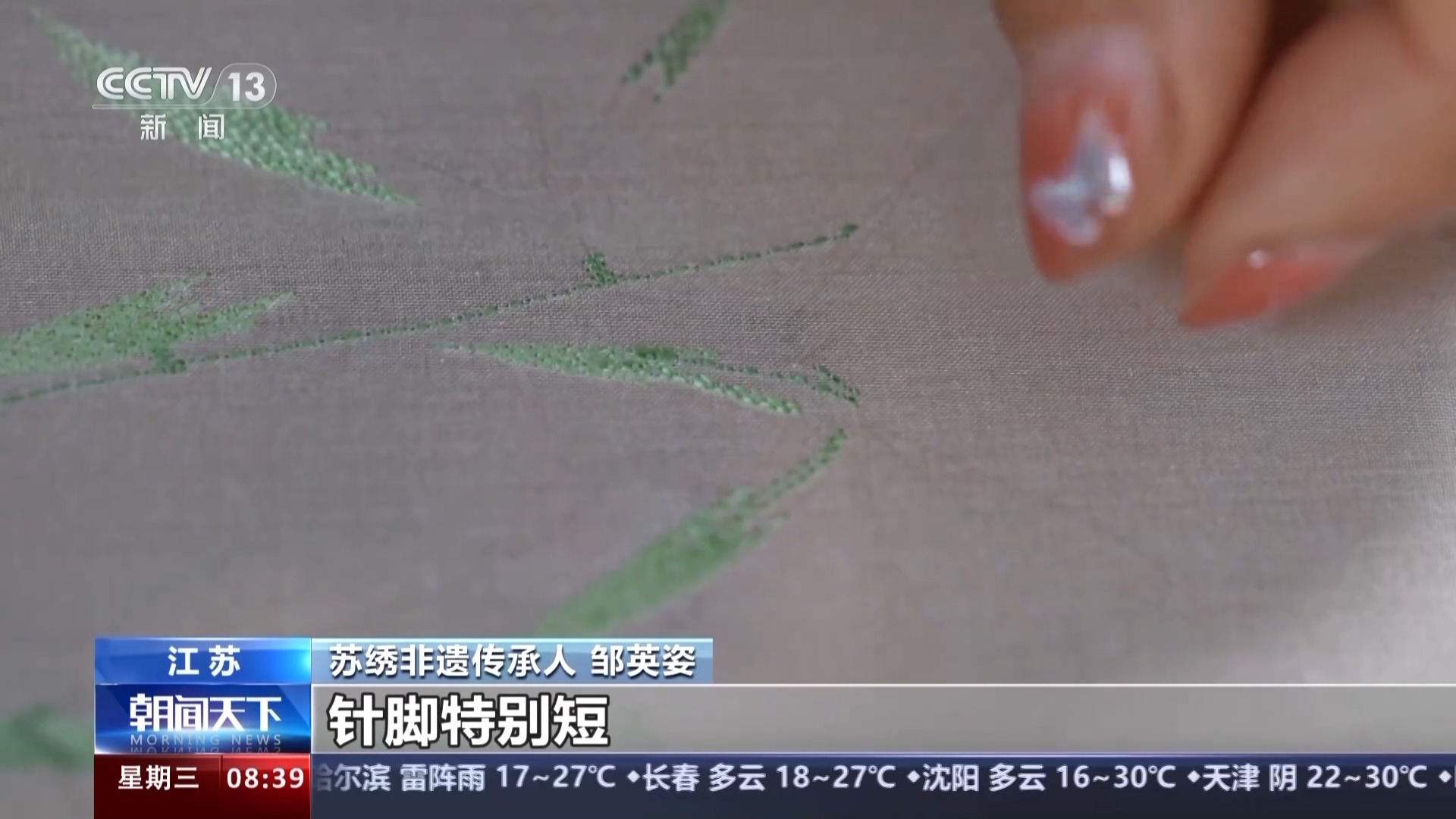 苏绣非遗传承人 邹英姿:这种从传统中走来的针法针脚特别短,间距在0.2毫米至0.3毫米。大家可以看到,滴滴绣之间有呈颗粒状的空隙,给人一种可以呼吸的感觉。
