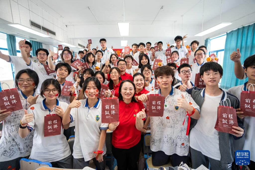 6月6日,在长沙市同升湖高级中学,师生们举起印有“前程似锦”的考前礼包合影。