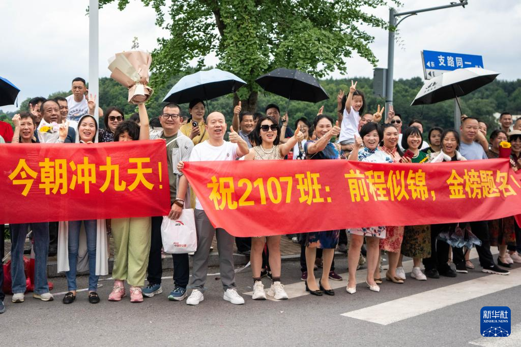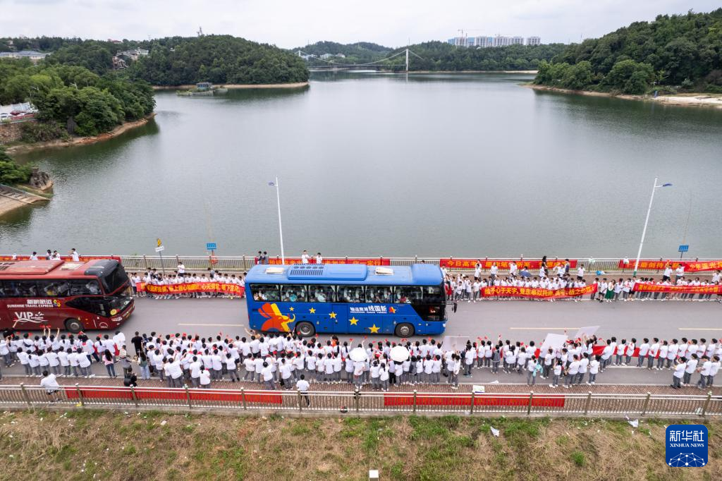 当日,湖南省长沙市同升湖高级中学举行送考仪式,鼓励高三考生轻装上阵,开心迎考。