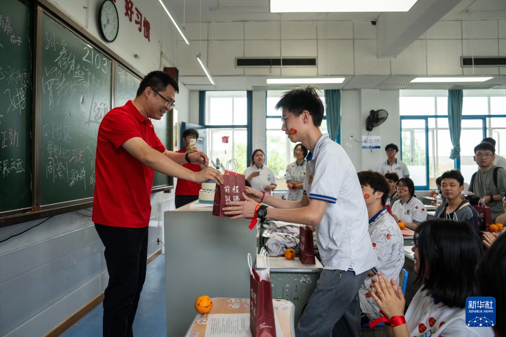 6月6日,在长沙市同升湖高级中学,老师(左一)为考生发放考前礼包。