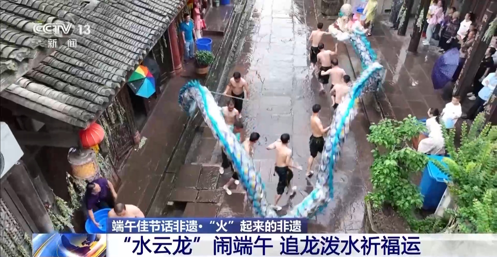 总台记者 牟亮:我现在所在的位置就是重庆市铜梁区的安居古城,在我身后正在进行端午节的非遗文化表演,这是水云龙的表演。10名赤膊的汉子正在舞动一条18米的蓝色水云龙,整条龙上下翻腾,左右腾挪,在两边明清时期的老屋之间穿行。而站在两旁的居民和游客,会拿着水瓢或者水盆,将清水泼向正在舞动的水云龙。虽然水云龙所到之处,大家衣衫都可能打湿,但是大家都乐在其中。