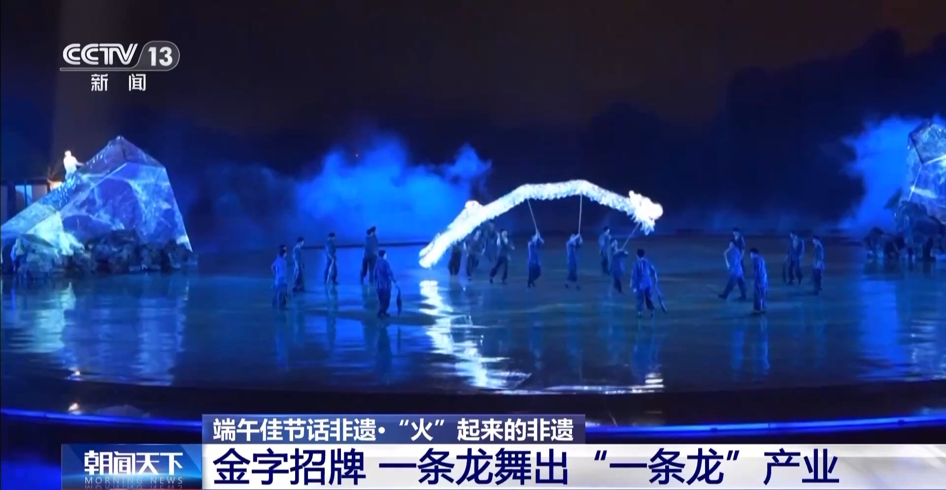 非遗的核心技艺在生产实践中得到传承。眼下,光是龙灯扎制业务,已经遍布全国十几个省份,平均每年订单超过1000万元。如今,扎制好的龙灯,更多是被用在当地的龙舞表演上。这是大型非遗山水实景剧《追梦 铜梁龙》的演出现场,观众可以看到水云龙、荷花龙等十几种铜梁传统龙舞,其中压轴戏,便是铜梁火龙。