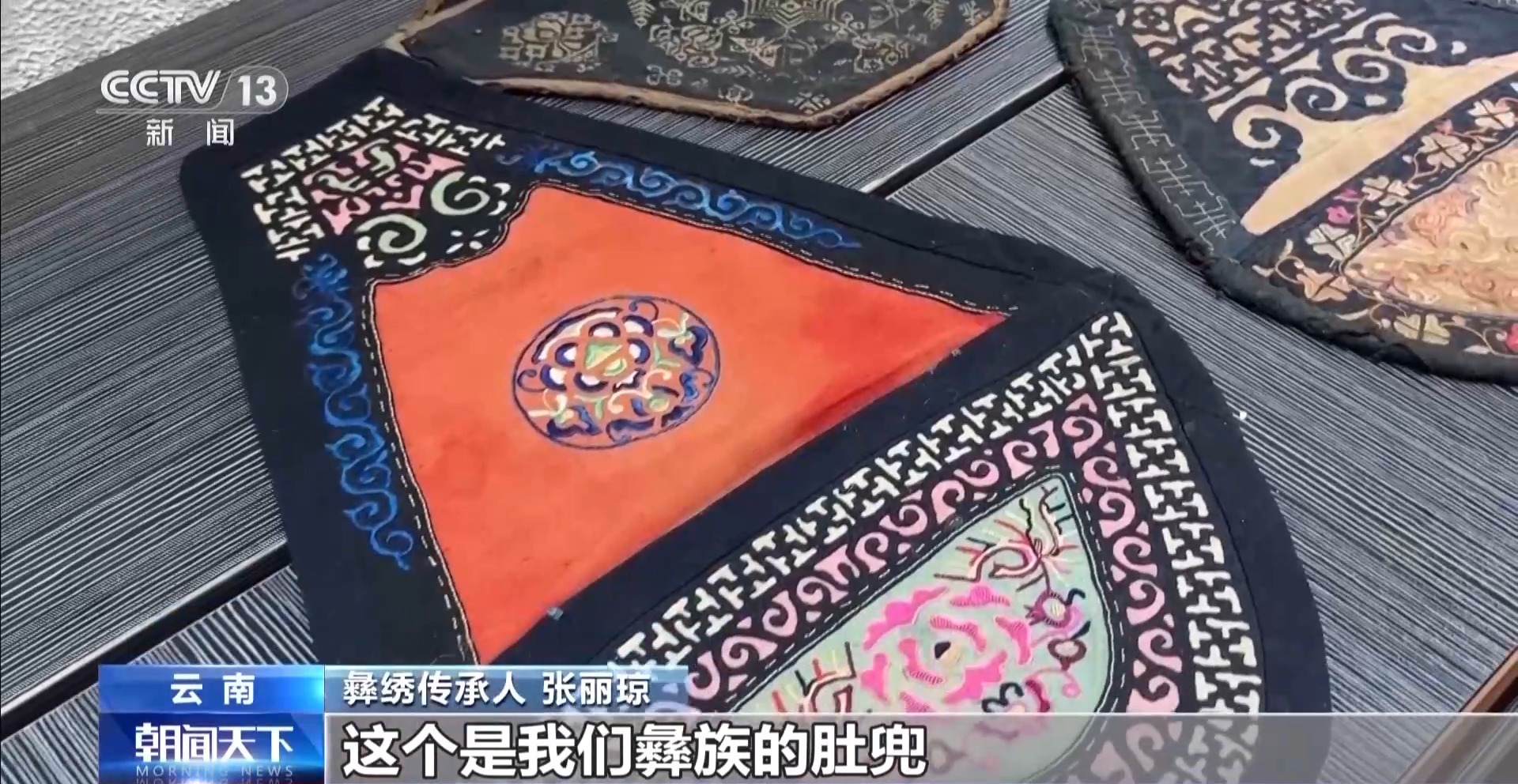 彝绣传承人 张丽琼:这个是我们彝族的肚兜,是彝族小姑娘送给彝族小伙子的定情物。它上面有很多现在已经失传的刺绣针法,像贴布绣、长针绣、平针绣。