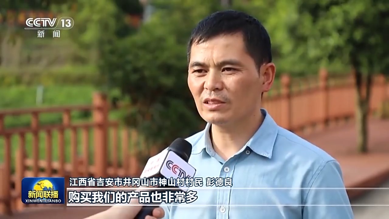 江西省吉安市井冈山市神山村村民 彭德良:游客越来越多,购买我们的产品也非常多,给我们增加了很大的收入。