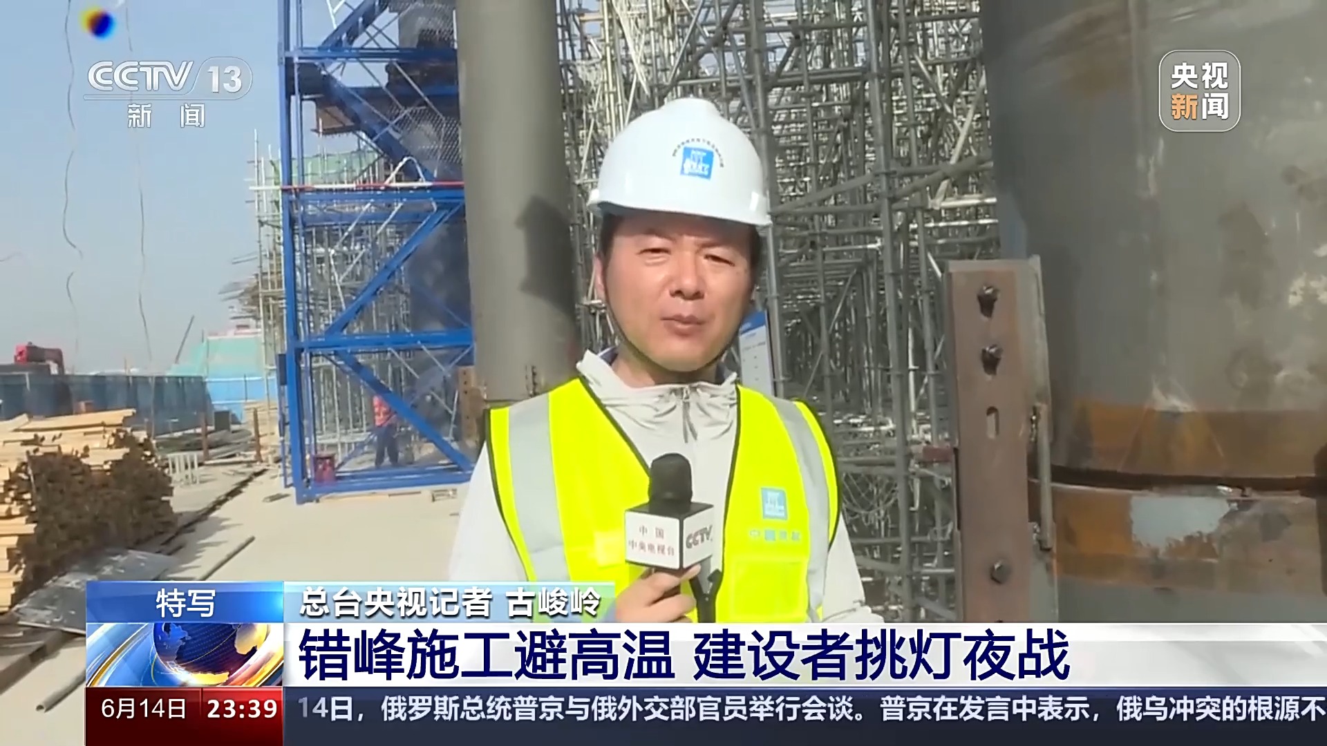 总台央视记者 古峻岭:虽然现在已经是下午四点多了,但是工地上的温度依然很高,让人汗如雨下。我们来检测一下这个工地上钢结构的温度,现在依然有43摄氏度左右。那么像这种高温,他们就要调整工作时间,错峰作业,避免人员中暑。