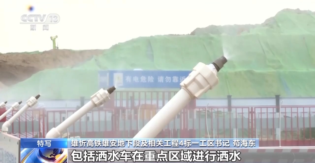 雄忻高铁雄安地下段及相关工程4标一工区书记 苟海东:中午咱们的地表温度达到了50多摄氏度,所以这个时间段是不再作业的,现在下午大概四五点钟开始上工。我们通过整个作业区周边这种360度的喷雾系统,包括洒水车在重点区域进行洒水,现在我们工地的施工区域的温度已经降到了34摄氏度以下了。