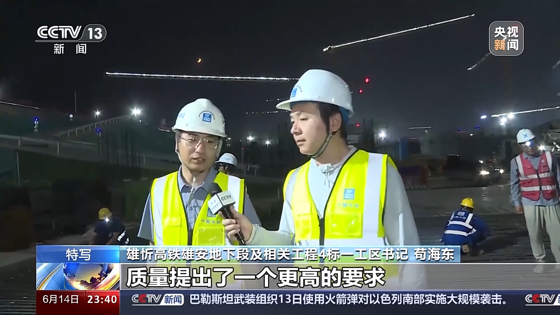 雄忻高铁雄安地下段及相关工程4标一工区书记 苟海东:其实夜间施工对我们的安全和质量提出了一个更高的要求。像平时这种钢筋的绑扎,以及我们的钢筋间距,都是我们检查的一个重点。你看这些穿红色马甲的都是我们的安全监督管理人员,夜晚施工我们增加了两三倍的管理人员,确保工程的质量安全。