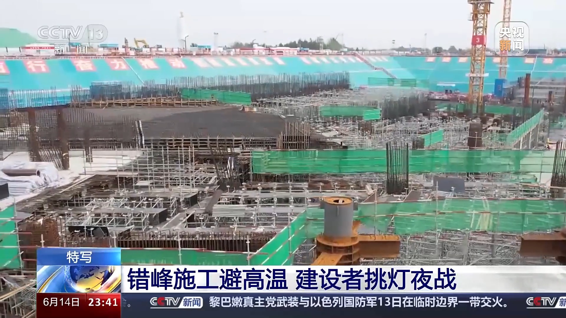 随着夕阳西下,工地上的温度也逐渐下降,建设者们也陆续开始进入作业现场。虽然高温天气施工时间调整到早上和傍晚,但露天作业依然非常辛苦。