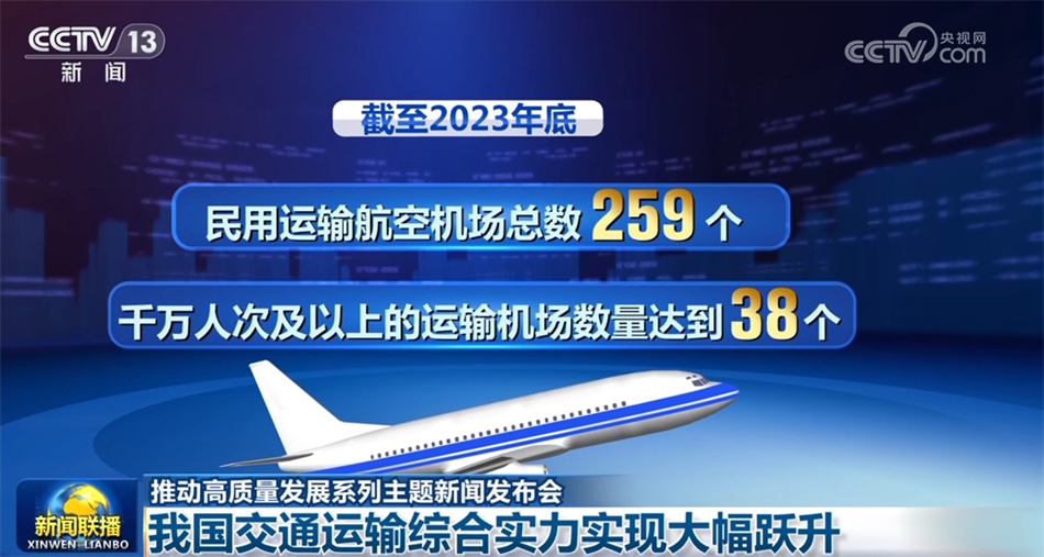 五年来,客货运输不断发展,群众出行更加舒适便捷,货物运输更加顺畅高效。截至2023年底,我国铁路营业里程15.9万公里,其中高铁营业里程4.5万公里;全国公路里程543.68万公里,其中高速公路里程18.36万公里;民用运输航空机场总数259个,千万人次及以上的运输机场数量达到38个。