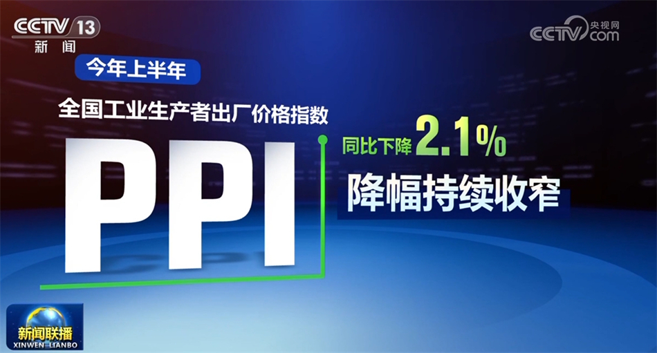 上半年,全国工业生产者出厂价格指数PPI降幅持续收窄,同比下降2.1%。