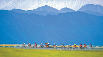 图为7月10日,参赛选手在第二十三届环青海湖国际公路自行车赛第四赛段的比赛中。