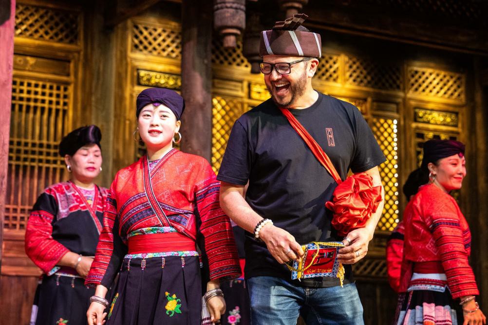 在广西龙胜黄洛瑶寨,外国游客与村民演员在红瑶民俗文化表演中互动(6月26日摄)。新华社记者 陈思汗 摄
