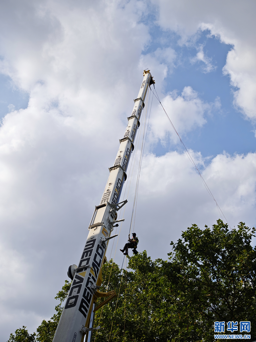 塞纳河边,工人在为高空器械做最后的检测调试工作。