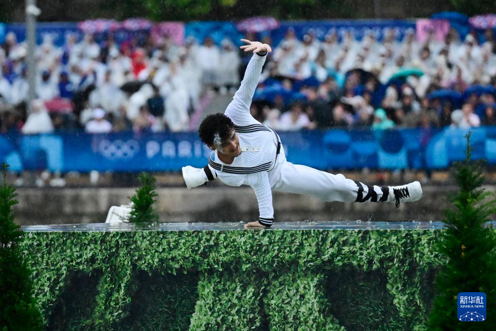 塞纳河中央出现了5个浮动舞台,它们由90个重量在1吨到5吨间的压载物和系泊线固定。这些舞台上出现了奥运会新增的4个体育项目,即兼具表演性、观众缘、包容性的霹雳舞、攀岩、滑板和冲浪。这些运动很年轻,在街道或大自然中时常可见。大雨中,一位霹雳舞演员兼歌剧演唱家不仅表演了霹雳舞,还演唱了歌剧《殷勤的印第安人》中的选段。