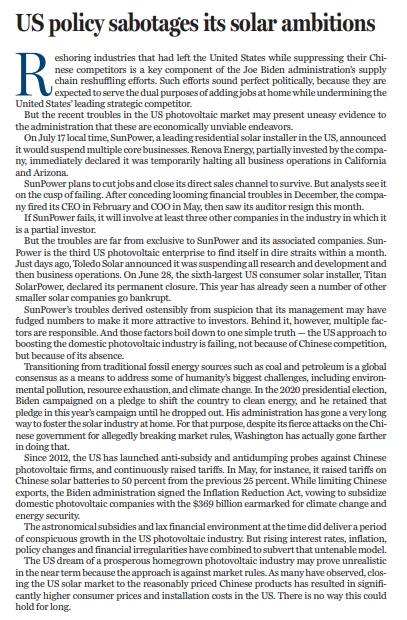 原标题:US policy sabotages its solar ambitions