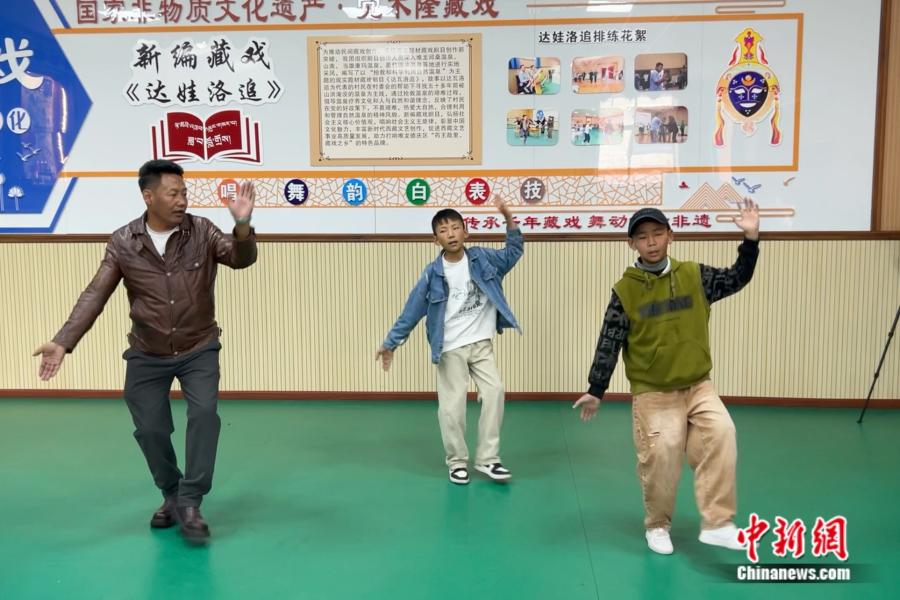 洛桑扎西现场指导藏戏小学员洛桑(右一)。 中新网记者 陈文韬 摄