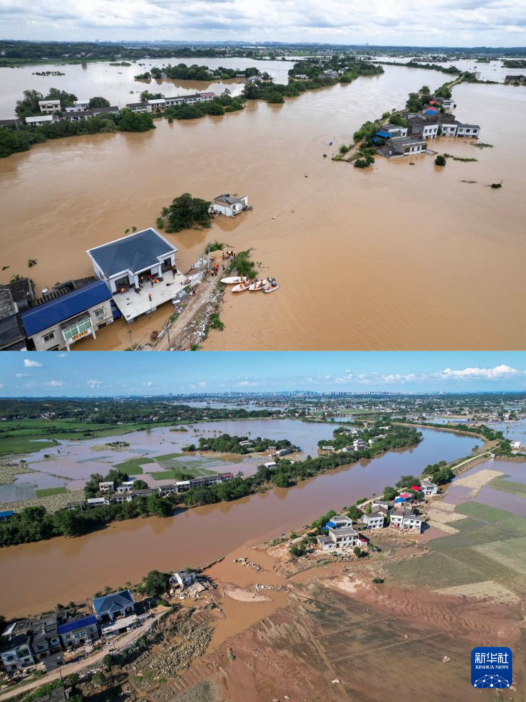 拼版照片:上图为7月29日12时拍摄的湖南省湘潭县易俗河镇四新堤决口现场(无人机照片);下图为7月30日16时拍摄的湖南省湘潭县易俗河镇四新堤决口现场(无人机照片)。新华社记者 陈思汗 摄