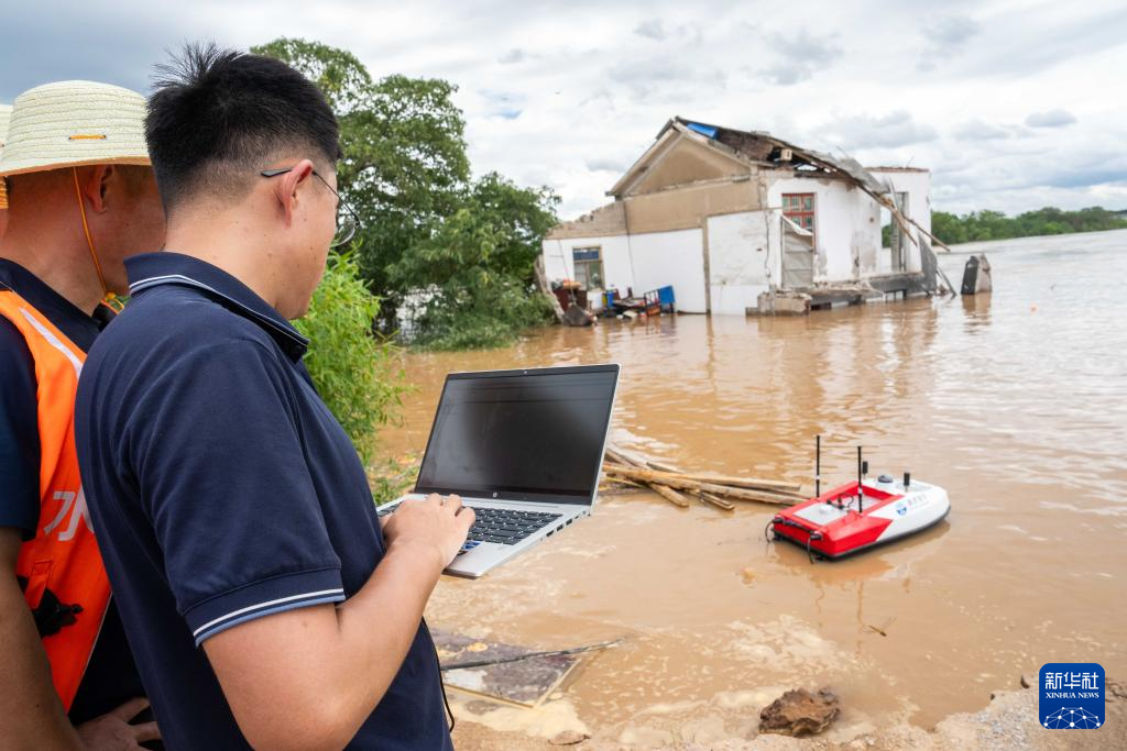 7月29日,在湖南省湘潭县易俗河镇四新堤决口现场,水利部门工作人员在测量决口附近的水深、流速等信息。新华社记者 陈思汗 摄