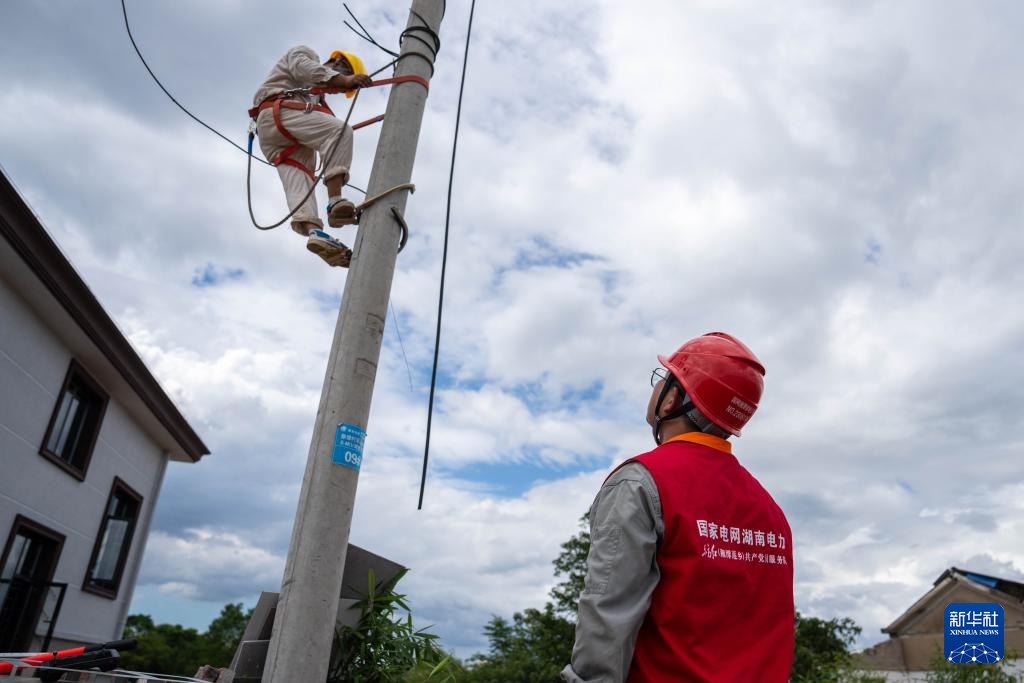 7月29日,在湖南省湘潭县易俗河镇四新堤决口现场,抢险人员在处理决口附近的电线。新华社记者 陈思汗 摄
